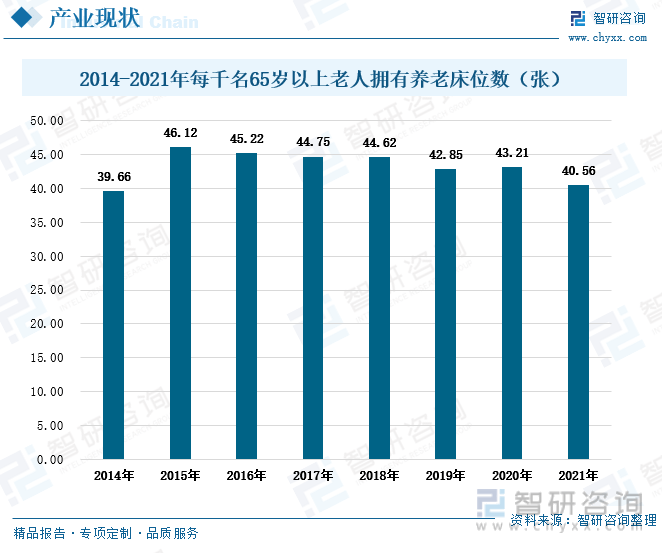2015年,我國每千名65歲以上老人擁有養老床位略有上漲后變呈現出逐步減少的趨勢,2021年我國每千名65歲以上老人擁有的養老床位數僅40.56張,較2014年僅增長了0.9張。我國每千名老人擁有的養老床位數下滑趨勢明顯主要是有老年人數量持續增長所致。養老床位的增長受到醫療資源、醫護人員數量等多方面因素的影響,因此其增速有限,而我國老年人口數量增速高于養老床位增速,因此我國千名老人擁有養老床位數量緩慢下滑。我國養老產業的市場開發空間巨大,未來智慧養老將迎來廣闊的發展空間。