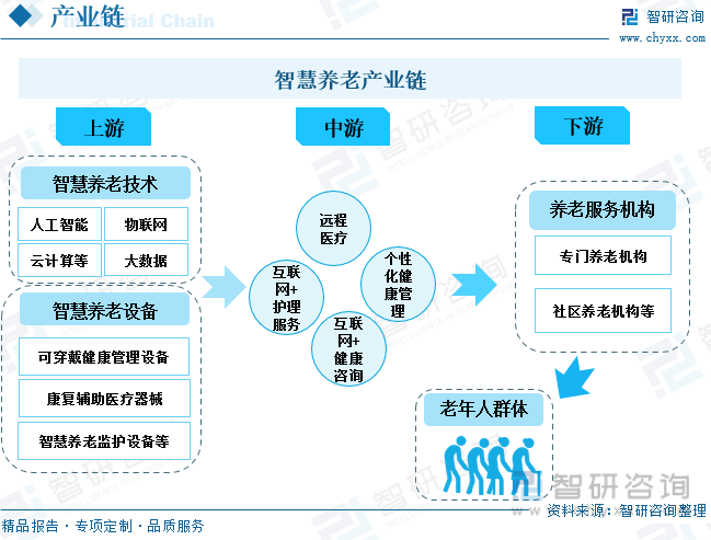 二、產業鏈:互聯網為智慧養老的發展提供技術保障,下游需求穩定增長